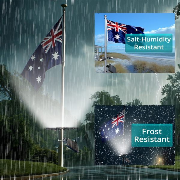 For commercial and public use, this solar flagpole light is well-suited to schools, clubs, RSLs, sporting venues, offices, hotels, caravan parks, showgrounds, memorial sites, and community buildings. It provides a practical off-grid lighting solution for flag displays where running mains power is expensive, inconvenient, or unnecessary. Its stronger coverage also makes it a good choice for prominent flagpoles in customer-facing or civic environments.