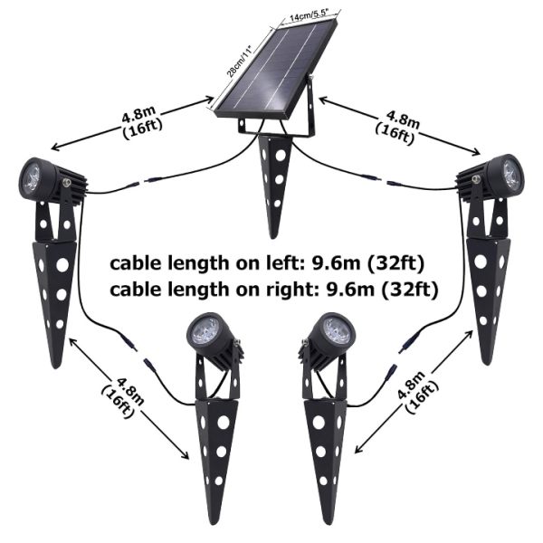 - Four independent light heads are connected to the solar panel with a 3m cord each.